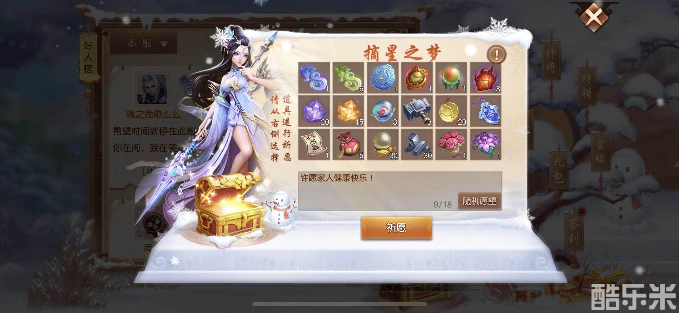 在新的一年,主公拥有怎样的愿望呢?在活动期间,每位主公每天都能选择一个心愿道具,系统将会抽取其中幸运儿帮助主公完成愿望。同时,主公也可以帮助本服、跨服的好友完成心愿,成功依靠心愿值上榜的主公还能获得限量称谓一个!