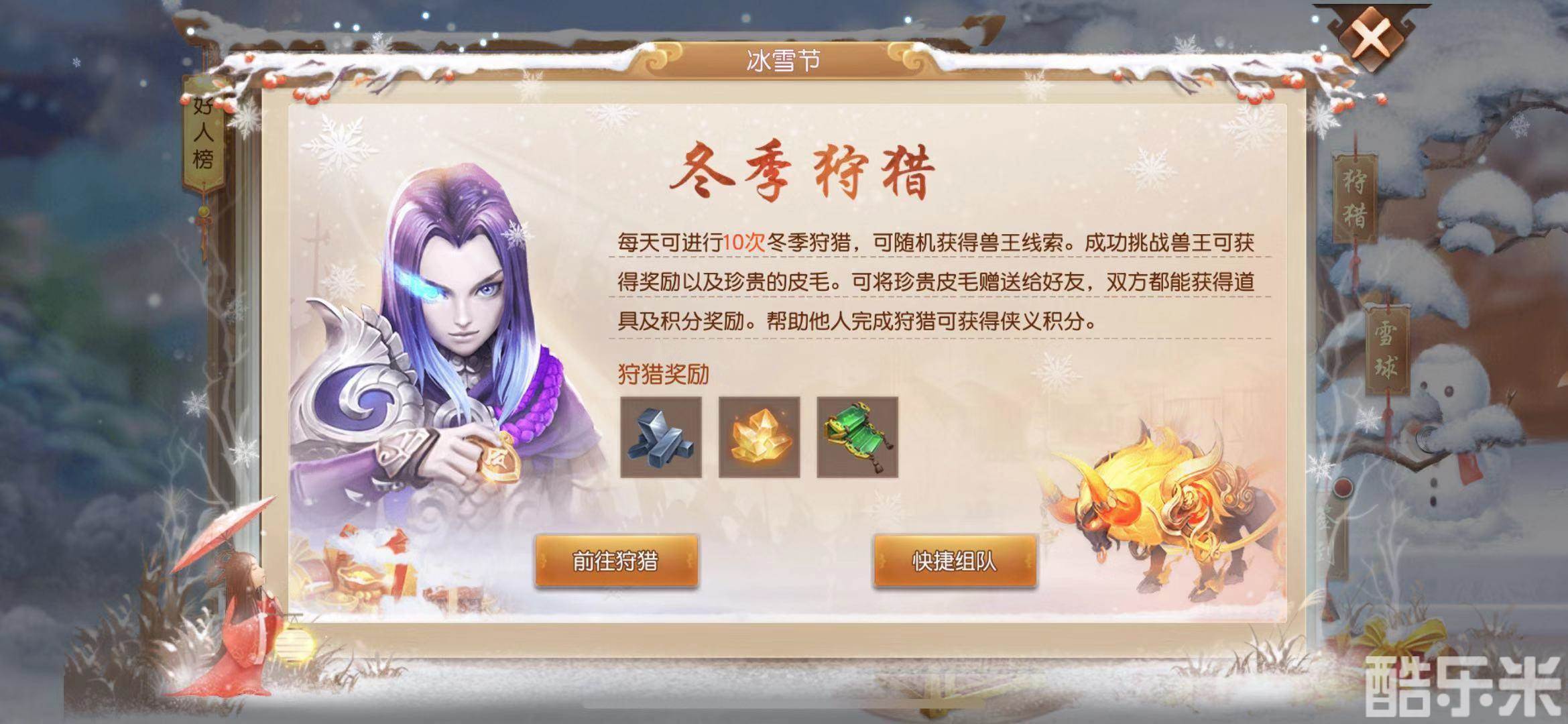 冬季正是奇珍异兽出没的季节。主公也能开启冬季狩猎活动,捕猎奇珍异兽。在彰显自己的强大实力同时,赢取丰厚奖励!