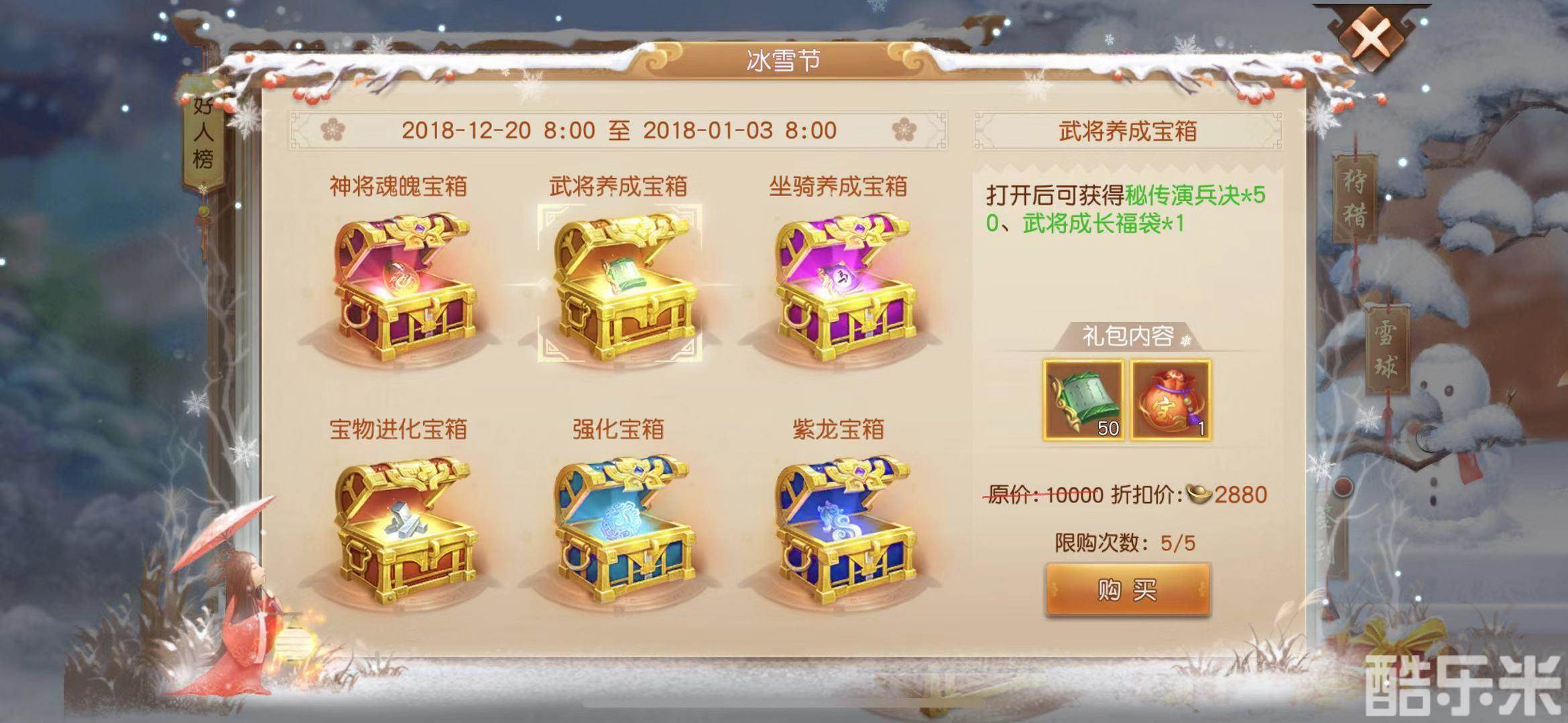 全新神将、坐骑以及丰富的精彩活动,为冰雪盛典带来了无限的惊喜。只要主公根据自己所需,选择参与其中活动,即可获取丰厚惊喜。也许在此过程中,也将收获神将和坐骑的青睐哦!