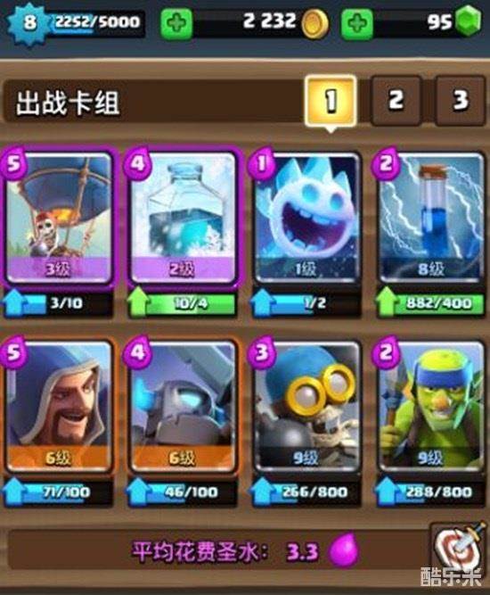 该卡组平均花费圣水3.3,费用低一直是气球流的核心套路,用最低的费用做最多的事情,而且这套卡组三张控制卡牌,搭配上法师远程AOE输出,打起来非常有优势。当对手地面部队到达桥头时,那么小皮卡+炸弹兵+哥布林投矛手则是很强的防守。
