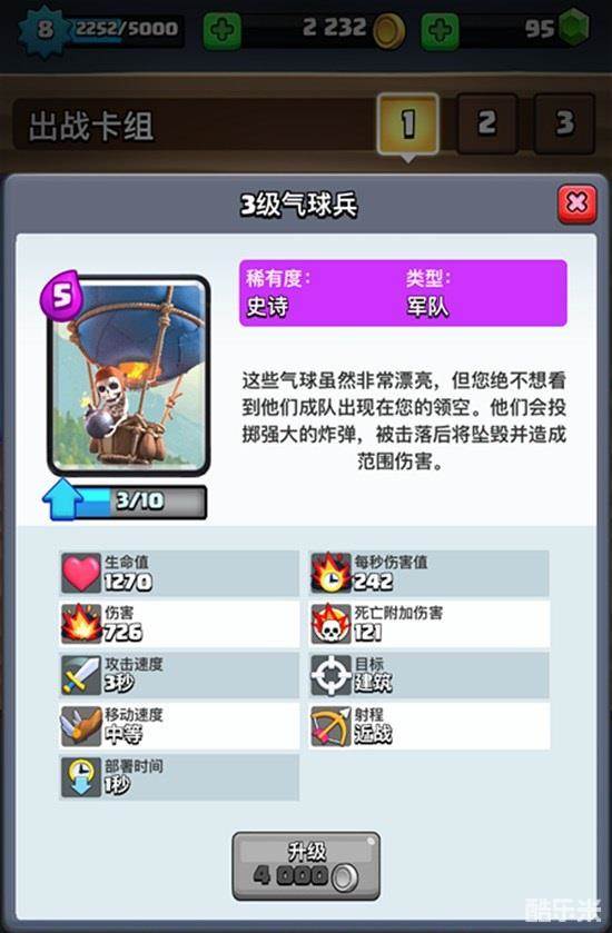 气球兵A2竞技场解锁的5费空中卡牌,具有高伤害、只会攻击建筑单位等特点。由于血量不高,特别需要其他卡牌的配合,因此该卡组中配合上三张法术卡,对于气球摧毁公主塔非常有效。
