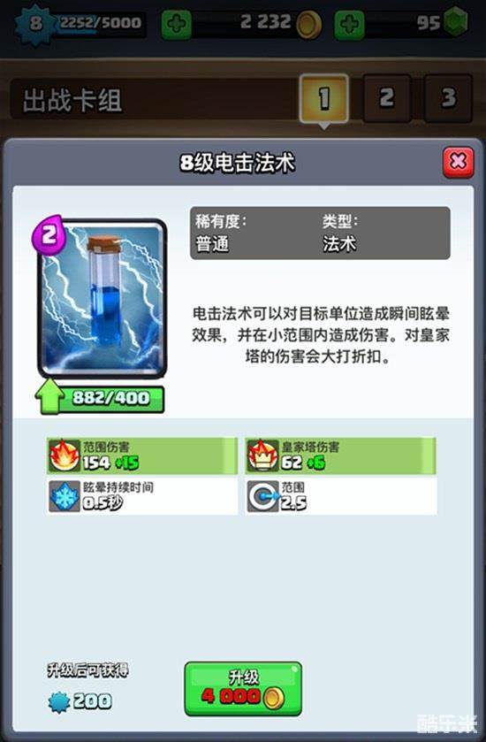 电击法术拥有1秒的控制时间可以让气球多输出一到两下,大量提高了气球对防御塔的伤害之余还能起到一个清场的效果,在同一环境下任何哥布林都是被一电带走。