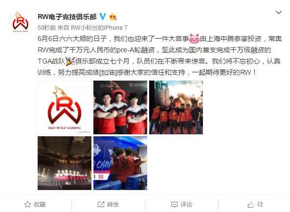 6月6号下午,RW战队官博更新微博,宣布完成千万融资,成为国内第一支完成千万融资的TGA战队。