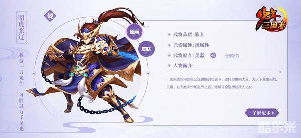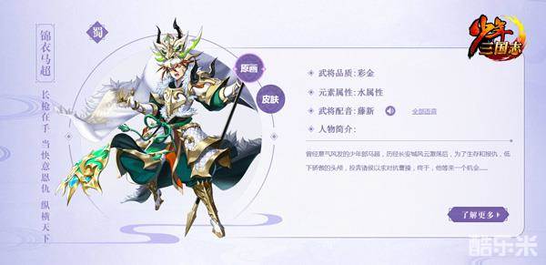同时,四位彩金武将还拥有游戏内首批定制的武将主题皮肤,四款皮肤分别为:未来战士·马超,防暴女警·吕姬,变脸大师·张辽以及幽灵船长·甘宁,玩家可根据个人喜好更换武将主题皮肤,使武将的主题特色与视觉效果获得丰富与提升。