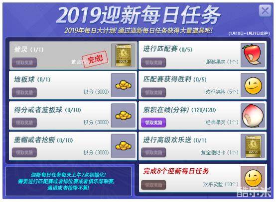 1月10日服务器维护后,2019迎新任务正式开启,玩家只需要登录、获得地板球、得分、盖帽或者抢断,进行匹配赛、排位赛、俱乐部联赛来完成任务。迎新每日任务上午7点初始化。