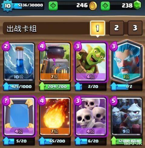 电击法术:辅助法术卡,小电在这里主要是用于对抗敌方的一些小型单位,比如哥布林飞桶和骷髅大军,以及亡灵大军等,同时在我们哥布林飞桶锁定敌方公主塔时,也可以用于辅助。
