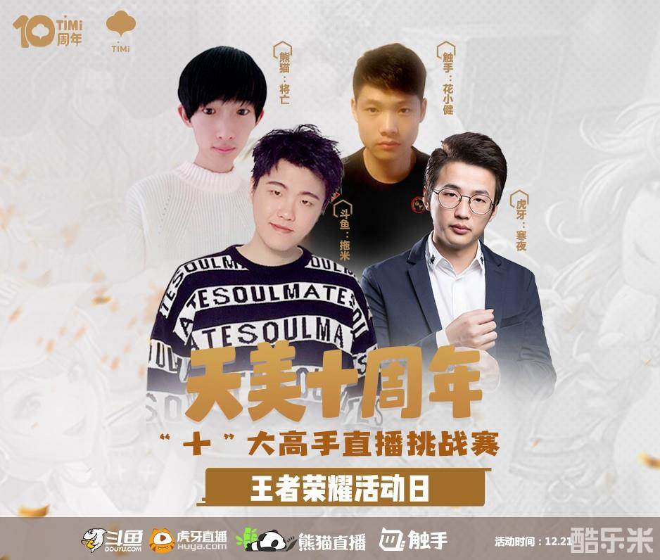 12月21日,【斗鱼直播】、【虎牙直播】、【熊猫直播】和【触手直播】将正式揭幕天美十周年《王者荣耀》分会场活动!