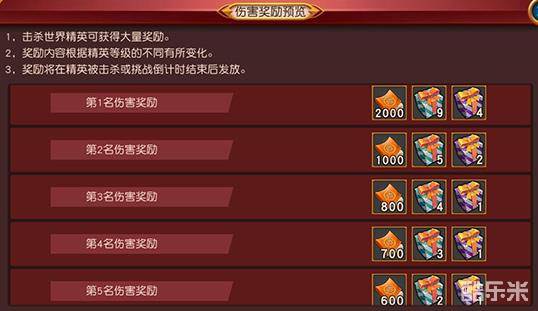 每次挑战《群英天下》世界BOSS获得的奖励,会根据参与者等级的不同从而获得相应的铜币。根据每次挑战BOSS造成的伤害会产生一个伤害排名,排名前十的玩家可以获得升阶材料、经验书奖励。击杀BOSS后还可获得大量铜币。挑战boss时如果为了冲击排行榜可以购买祝福,能够提高伤害和会心,当然这个祝福在每次挑战boss后都有20%的概率获得。