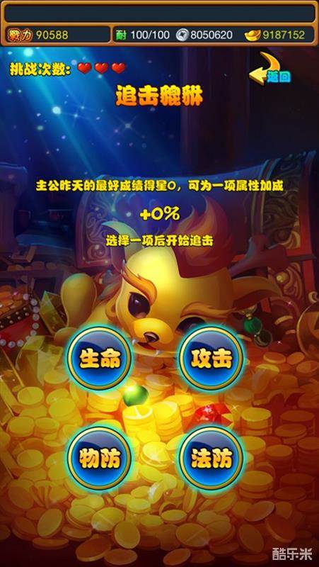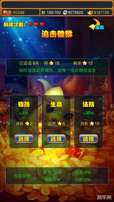 5、追击每过3关,玩家可以分配获得的剩余星数,用来加强3种属性,会随机从生命,攻击,物防,法防挑选3个。玩家可以在上方看到自己目前的加成。