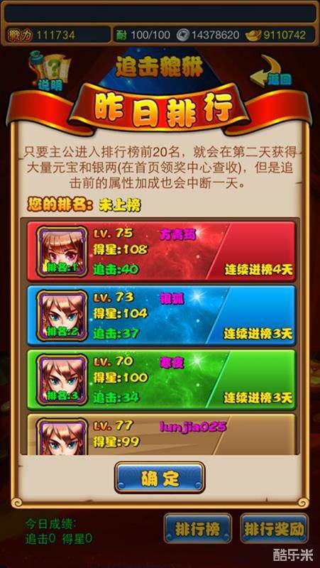 3、根据玩家追击的关卡数会有一个追击排行,可以在其中领取对应的奖励。
