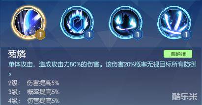普通技菊燐:初始的伤害为攻击力的80%,满级伤害是105%,特殊效果无视防御的基础概率为20%,满级的概率为30%,而无视防御受效果命中几率影响。