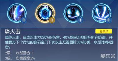必杀技燐火击:初始伤害为攻击力的220%是个单体伤害技能,满级伤害为225%,它同样带有无视防御的特殊效果,受效果命中属性加成。