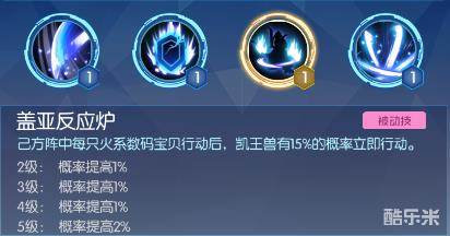 被动技盖亚反应炉:己方阵容中每只火系数码宝贝行动后,凯王兽都有15%的概率触发协战,满级的概率达到20%。