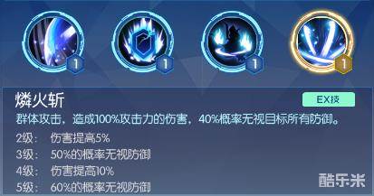 EX技能燐火斩:初始伤害是100%攻击力的AOE的技能,满级115%伤害,无视防御的概率为40%,技能满级后基础概率提升至60%。