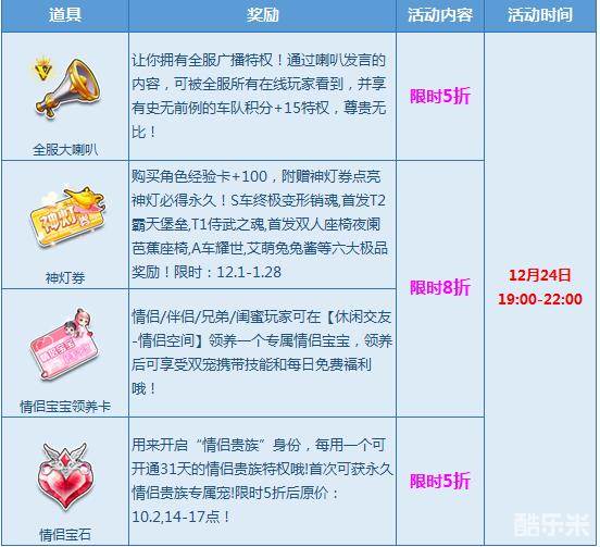 12月24日19:00-22:00期间,圣诞节特别活动登场,【全服大喇叭】/【情侣宝石】限时5折,【神灯券】/【情侣宝宝领养卡】限时8折,还有精美【雪鸢白羽套装】/【暗夜黑羽套装】限时8折,赶紧来参与!