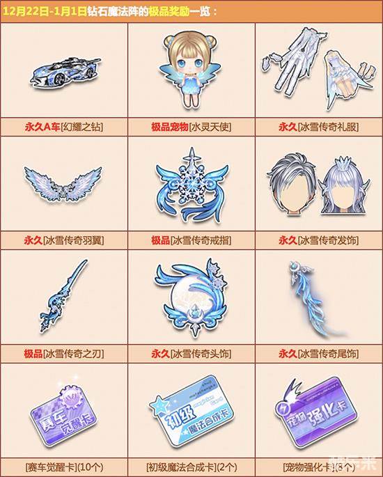 12月22日-1月1日,使用召唤卡召唤极品道具,即有机会赢取永久A车【幻耀之钻】、极品宠【水灵天使】、永久冰雪传奇系列道具!