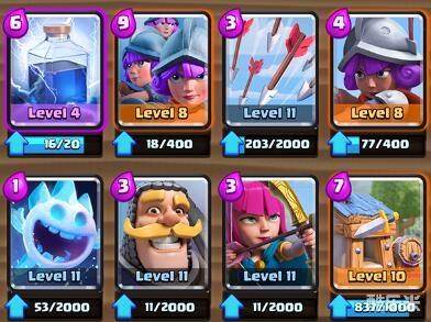 这卡组的特点就是前期稳守。然后中期看准机会利用三枪的爆发力造成致命伤害。后期利用法术打本斩杀或者直接四枪+人海强攻。这套卡组是一紫三橙4白。价格低廉,卡牌获取容易。野蛮人房子是10级。其他卡片等级都是处于4811的状态。唯一的紫卡大闪电只有4级,已经足够去除10级的法师和火枪。在4500杯附近够用。