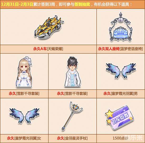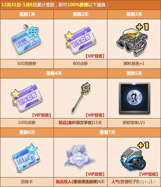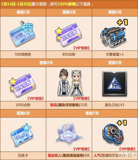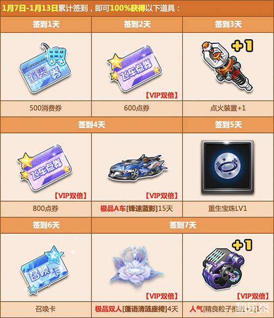 最后编辑于6年前12月31日起,每天登录游戏完成签到任务,即可获得丰厚的点券奖励、人气道具、极品A车和双人座椅福利!累计签到一周,即可免费领取极品双人座椅【蓬语清涟座椅】、极品A车【锋速蓝影】/【灵幻橙风】及最高可获得18000点券。累计签到3周,还可以抽取永久A车【天蝎荣耀】、极品双人座椅【蓝梦密语座椅】、极品套装【雪影千寻套装】等惊喜奖励!