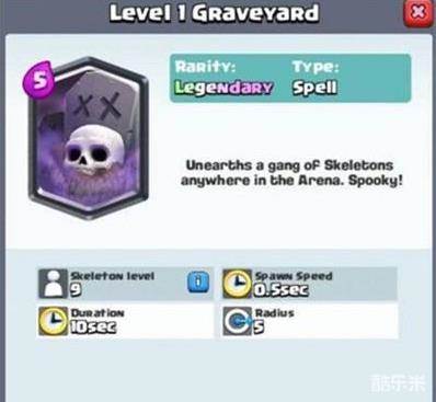 召唤骷髅:传奇卡、5阶解锁、费用5点、在施法区域召唤骷髅,0.5秒召唤一只,持续10秒,一共20只,1级墓地能召唤9级骷髅。