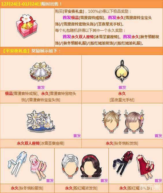 12月24日-1月24日期间购买【平安夜礼盒】,100%获得首发极品【雪漫音铃戒指】、首发永久【雪漫音铃宝宝头饰】/【雪漫音铃宠物头饰】/【圣夜星光手杖】!每个礼包随机获得以下其中一个永久极品奖励:首发永久双人座椅【冰雪圣宴座椅】/首发永久【秋冬悄粉发饰】/【秋冬悄粉服饰】/【殷红嫣浓发饰】/【殷红嫣浓礼服】。