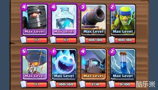 卡组构成:黑暗王子、冰冻法术、加农炮、哥布林投矛手、气球、冰精灵、小闪以及电击法术