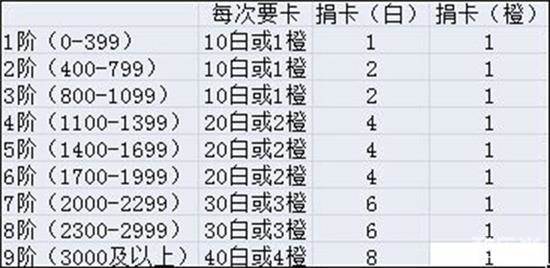 捐卡分析:通过以上表格可以看出来,从1-9阶,每次能捐的白卡和每日捐卡上限是随着级别上升增加的。每次可捐的橙卡却是每次一张一直没有变化。我们知道,每次捐一张橙卡相当于十张白卡的金币和经验(1橙=10白)。而对于我们不会每天不停翻手机的玩家来说,每天捐卡数通常是不会到达上限的。所以我们可以看出,捐橙卡的性价比要比白卡大很多。尤其在低等级4~6阶时。
