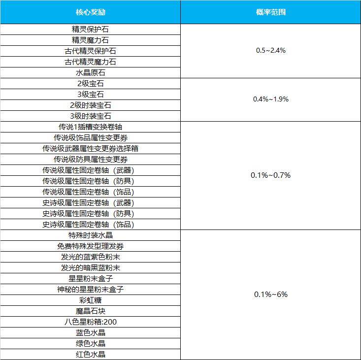 二、圣诞幸运礼包,开启1次和开启10次,核心道具概率如下: