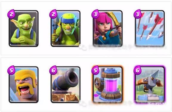 那么圣水采集器为何也是核心呢?因为X-BOW卡组,在中期亮出X-BOW后,双方的每次交战几乎都是一次围绕着X-BOW的战斗。而X-BOW本身在攻击对方防守单位时输出相当于2圣水的哥布林投矛手,也就是说每次亮出X-BOW之后,我们都得打一场天生亏四圣水的战斗。打赢,对方的皇冠塔就非常危险;打输,X-BOW迅速被拆并且对方防守部队过河;所以除非我们取得了巨大费用优势,不然的话我们最好在领先对手一到两个圣水采集器的情况下再下X-BOW。这么一来,圣水采集器也成为了核心。