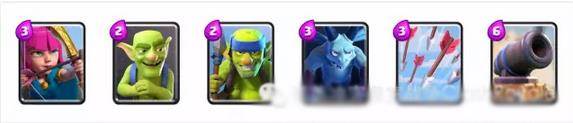 作为进行配合和辅助的牌,这套卡组的原作者选择了弓箭手+哥布林+哥布林投矛手。我自己使用的时候放弃了防御效率低下的哥布林投矛手,选择了效率超群且不会太亏圣水的亡灵。当然哥布林投矛手虽然防守效率低下,但却有别的卡无法比拟的磨对方塔血量的能力,3个哥布林轮流抗塔打出7矛的输出,7级以上哥布林投矛手一轮无干扰的磨血约是300左右。我认为这个卡组更需要的是效率的防守而不是磨血,所以会选择使用亡灵。