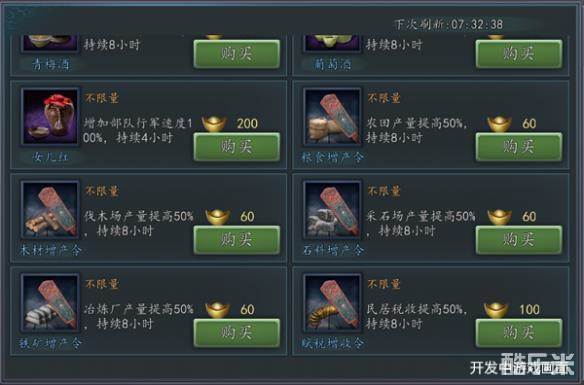 c)、游戏商城中还可以购买资源增产令,售价60元宝。增产令功能统一为:资源产量提高50%,持续8小时。