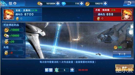 每次掠夺都需要消耗1点传送能量,而传送能量需要时间才能恢复,如果心急的玩家可以花费一定的钻石即可购买传送能量,这对资源需求大的玩家来说是个很好的选择。