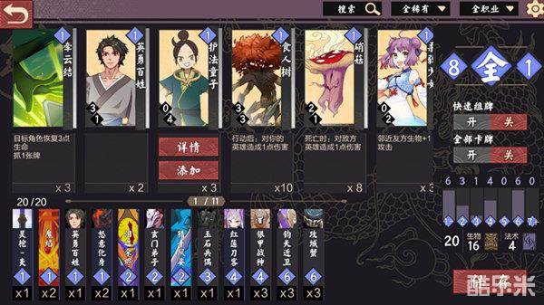 进入组卡界面后,通过拖动卡牌,玩家能够将卡牌收藏中的卡加入卡组,或将卡组中的卡放回卡牌收藏。也可以点击单一卡牌,查看卡牌详情或进行组卡操作。