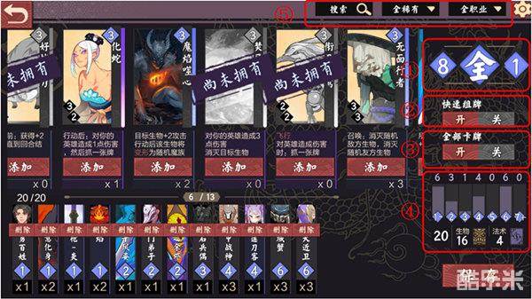 4.已组卡牌的灵力消耗构成,玩家可以从这里较为直观地查看目前卡组里各灵力消耗的牌有多少张,以及生物牌和法术牌的牌量。