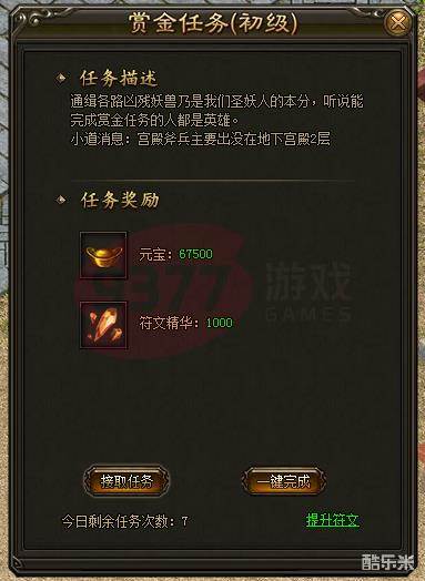 玩家在赏金任务面板里,点击“接取任务”后,可领取悬赏任务,并点击“前往完成”即可立即到任务地点。玩家在目的地里,只需击杀指定数量的怪物,就能回到任务NPC处,去领取任务奖励。