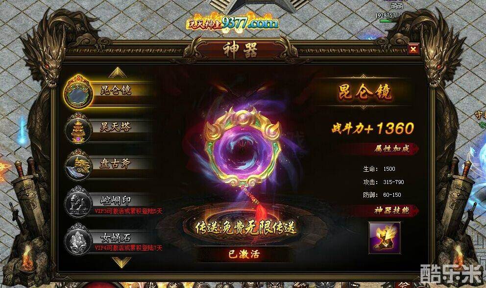 1、昆仑镜:激活昆仑镜后,可以免费无限次使用传送功能;