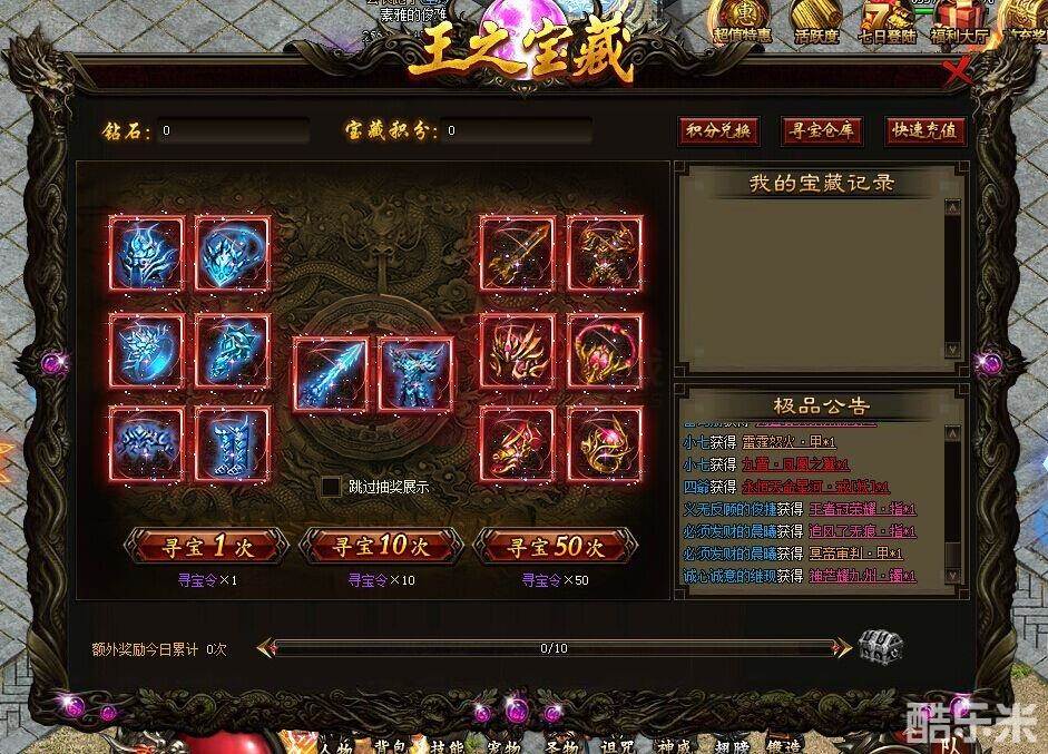 玩家寻宝的过程中,可随机获得王之宝藏里所藏有的各种不同阶数的装备。玩家寻宝次数达到一定条件,还能额外领取到一些神威令奖励。随着寻宝次数增多,玩家还可积累到更多的宝藏积分。