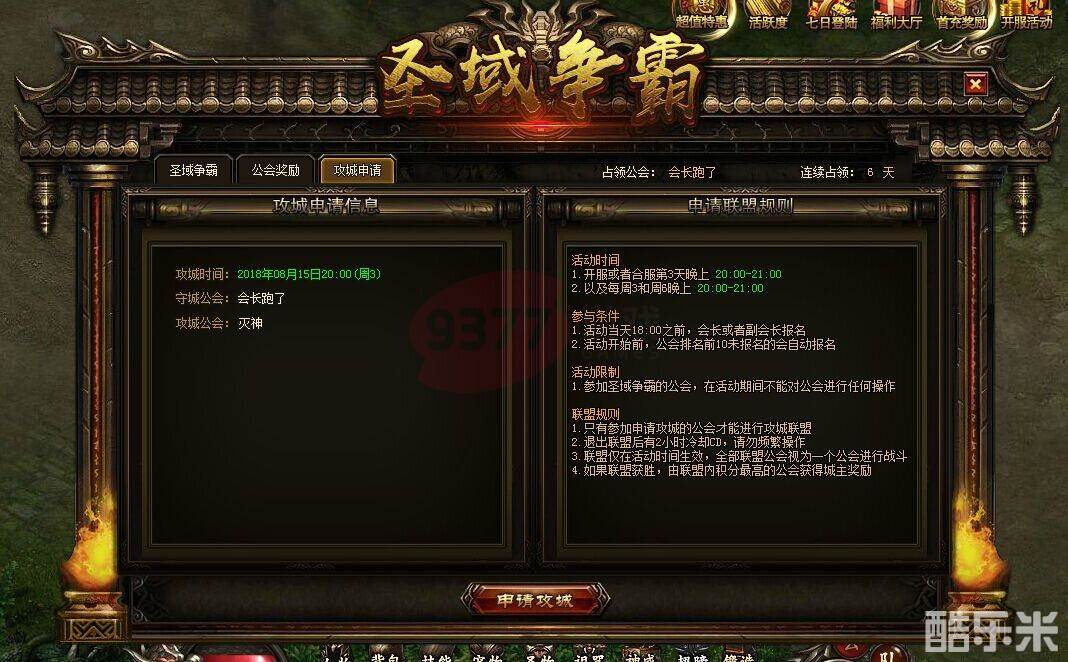 首次圣域争霸战,于开服或合服第3天20点至21点开启,之后每周三、周六晚20点至21点开启。会长或副会长才可以申请圣域争霸报名,上次活动到这次活动2小时前,报名申请攻城。
