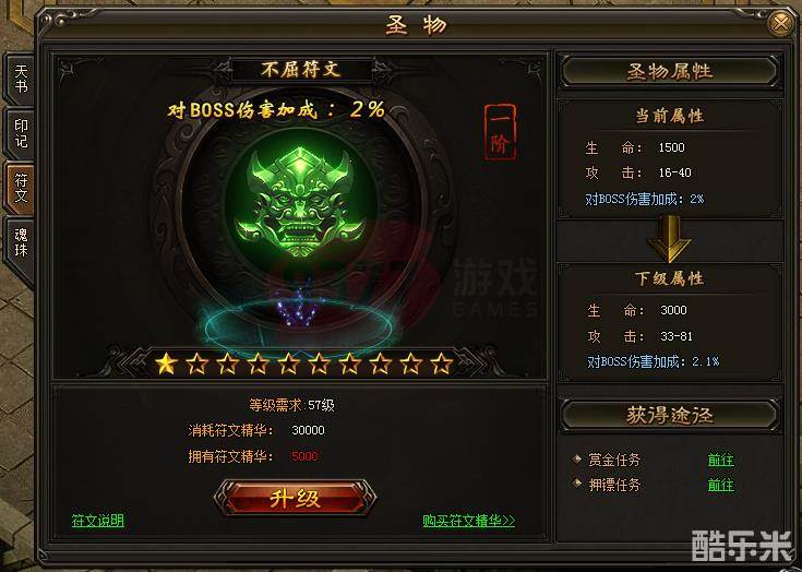 玩家每提升1星或1阶符文,符文的属性效果会得到提升。符文所提供的属性效果,有生命、攻击、对BOSS伤害加成等。符文升级所需要的符文精华获得方法,可通过赏金任务、押镖任务等途径来获取的。