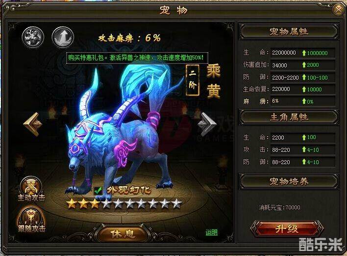 无论宠物星级提升或宠物进阶提升,宠物可获得生命、伤害主加、防御、生命恢复、麻痹的属性想效果,而主角可获得生命、攻击、防御的属性效果。玩家进阶宠物获得的各种新造型,都可以自由进行外观幻化,切换自己喜欢的宠物造型哦。宠物只会攻击怪物,不会攻击玩家的,这一点大家就要注意一下。宠物可使用快捷键A来召唤的。