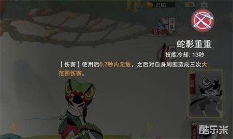 3、二技能(七步蛇毒):控制和持续伤害技能,即:技能发动后,一者使目标陷入中毒状态,令其不断掉血;二者目标走得越远、被动承受的伤害越高,是一个收割和强制性较高的技能。