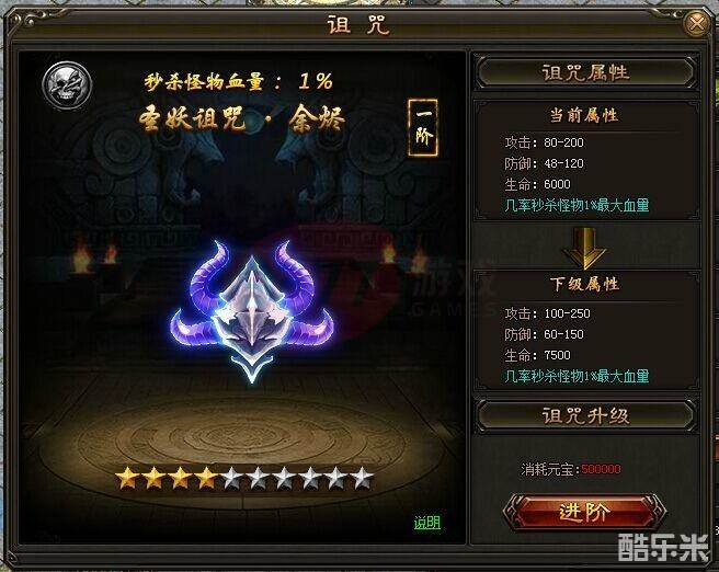 玩家提升诅咒等级后,可提升诅咒的属性效果,该系统所提供的属性效果,有攻击、防御、生命、几率秒杀怪物相应比例zui大血量。秒杀怪物血量的属性,只会对怪物生效,尤其是对BOSS的效果是比较好的,而对玩家则是无效的。