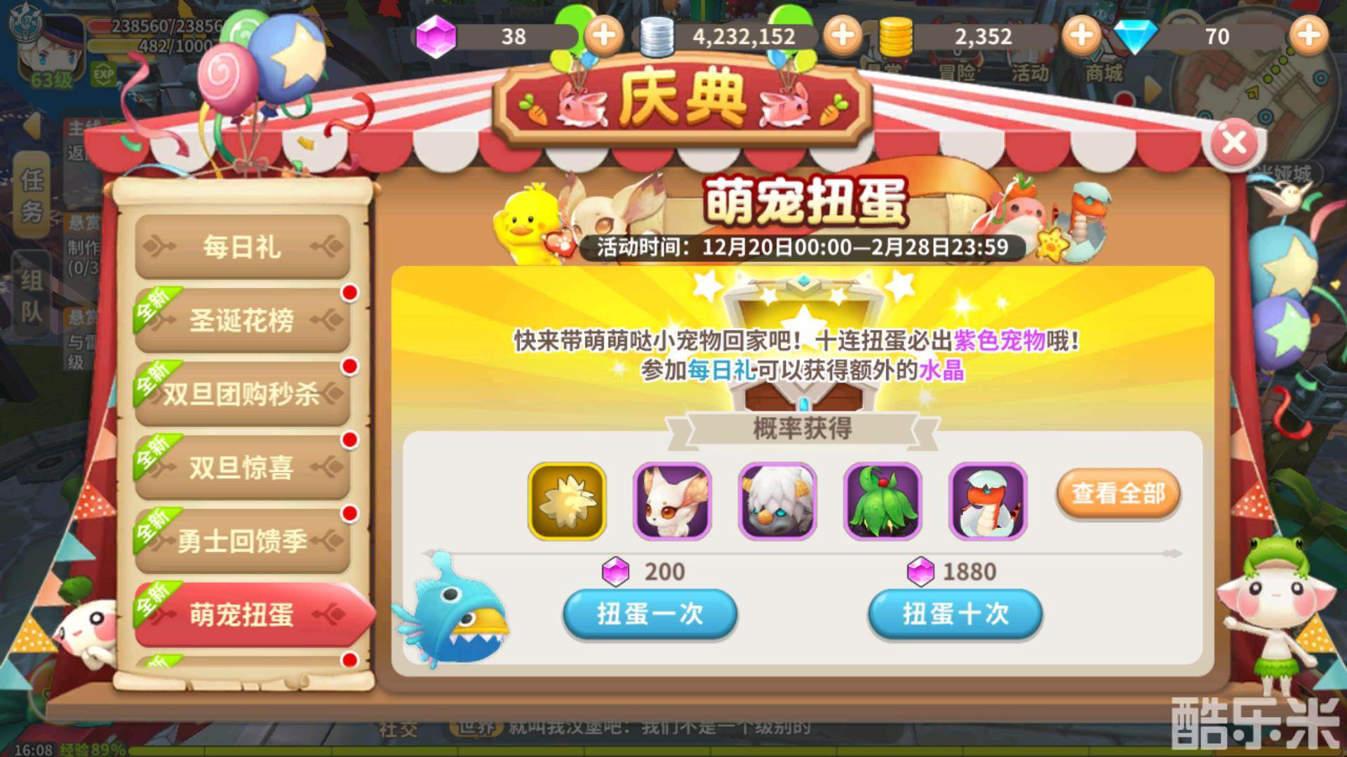 玩家们点击庆典按钮,就可以看到新推出的萌宠扭蛋活动了,在萌宠扭蛋活动中,玩家们每花费200水晶就可以进行一次抽奖,在有几率获得翘首以盼的宠物们哦。可以获得的宠物有很多,有紫色也有蓝色。