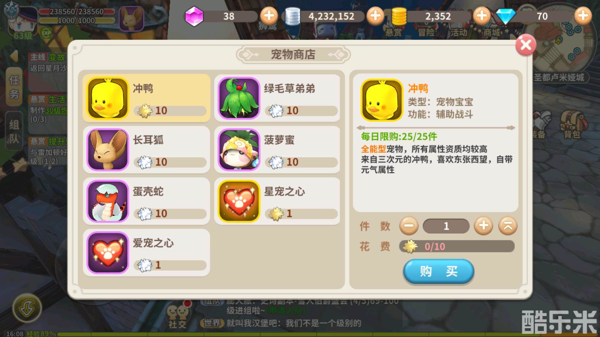 还有就是玩家可以在NPC妮娅出打开宠物商店,可以利用扭蛋活动中获得的金银绒毛进行宠物的兑换,其中可以看到,紫色的宠物需要10个银色绒毛,而最强的金色全能型宠物则需要10个金色容绒毛,并且绒毛还可以兑换宠物升星的消耗品。