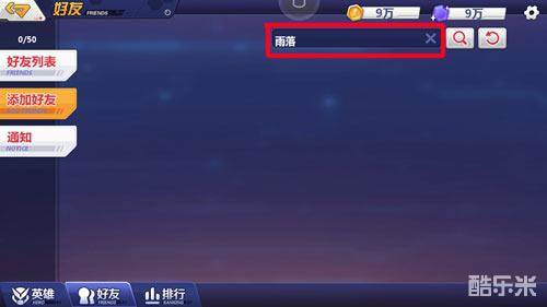 在好友栏目左侧有三个按钮,点击中间的“添加好友”,然后点击屏幕右上角的输入栏,在里面输入好友名字。小编用新手机登陆游戏,输入另一个账号雨落的名字进行搜索。