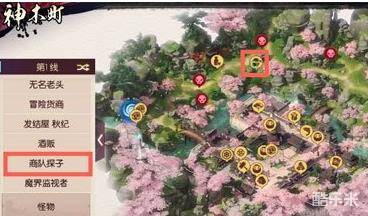 1这个任务需要大家来到地图神木町,因为这个任务发生的地图就在神木町,大家只要打开点图,点击神木町就可以了,到了神木町之后,在当前地图中点击截图地图上的位置,或者打开左边的引导路线,然后点击【人物】中的【商队探子】。