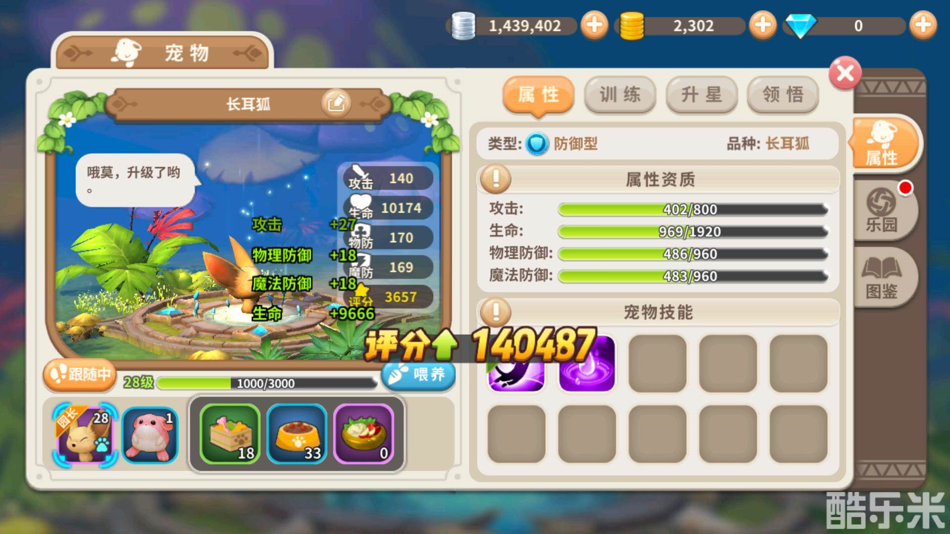 可以看到,皮皮骚55级的长耳狐已经拥有276点攻击,19985的生命,334的物理防御以及332的魔法防御。而在乐园玩法中将长耳狐设定在不同的位置则可以获得不同的属性,其中的爱心园长更是全属性继承哦,直接让你的战力飙升。