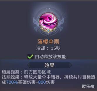 技能效果:释放大量伞中暗器,持续共对目标造成700%基础伤害+800伤害