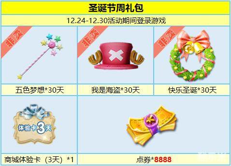12.24-12.30,任意一天登录游戏即可领取圣诞节周礼包一份!小小仙女棒、海盗帽、圣诞节挂环~都是非卖哦!