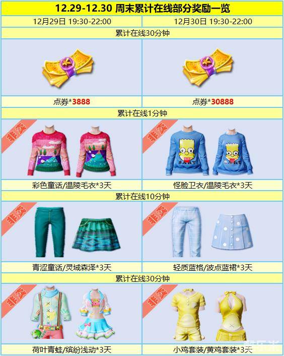 12.29-12.30晚上19:30-22:00,累计在线1分钟、10分钟和30分钟,就能轻松获得随机非卖服饰+套装,另外还有34776点券赠送哦~