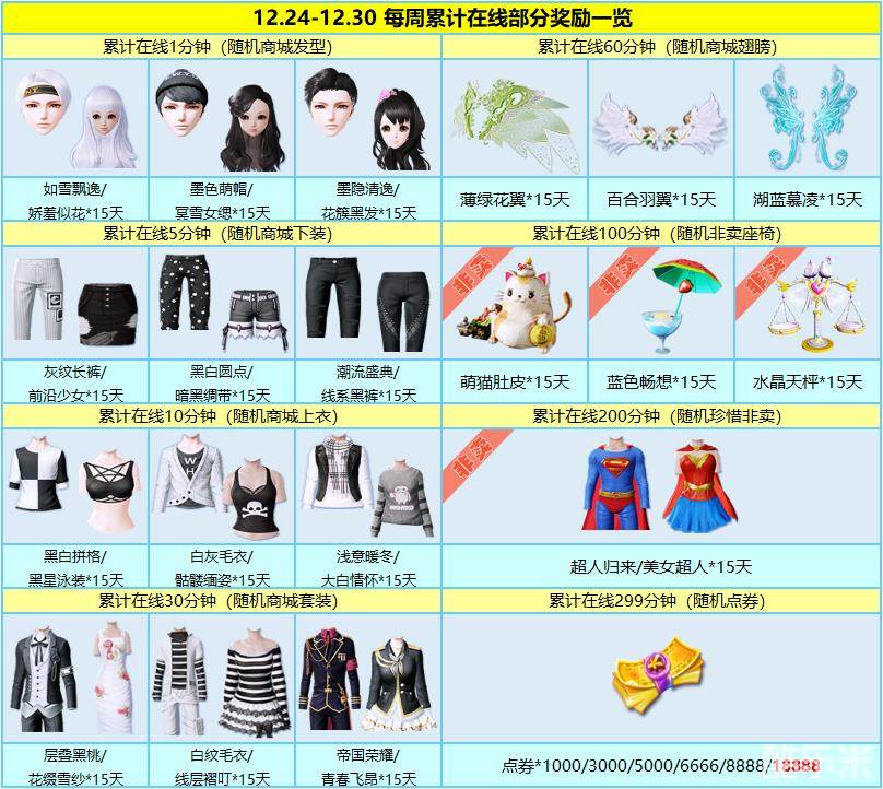 12.24-12.30,周内累计在线1分钟、5分钟、10分钟、30分钟、60分钟、100分钟、200分钟、299分钟,商城金币服饰以及非卖座椅,统统送给可爱的你,助你美美的跨年~